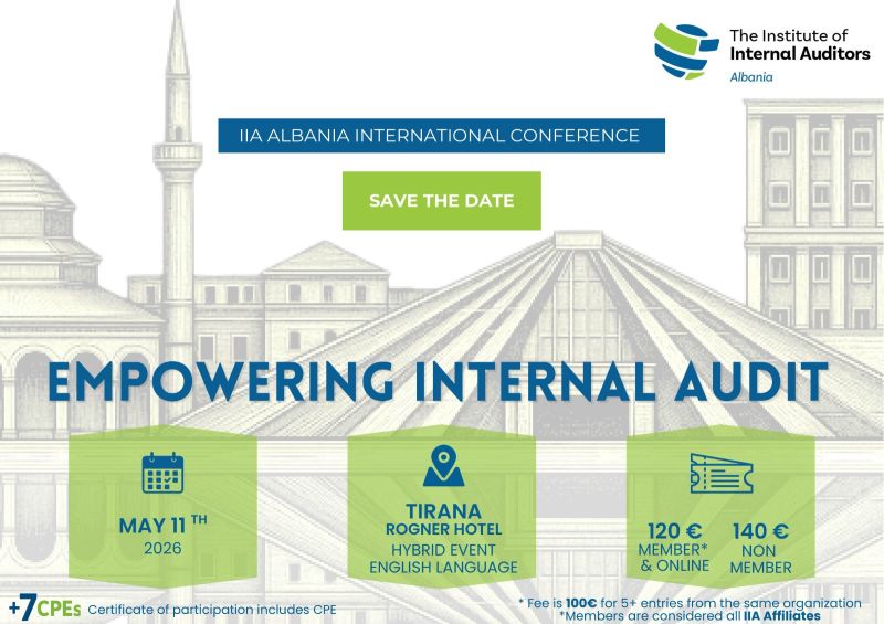 Со задоволство Ве информираме дека IIA Albania International Conference 2026 ќе се одржи на 11 мај 2026 година во Rogner Hotel, Тирана.