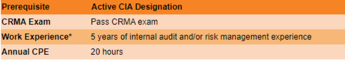 Кандидатите мора да имаат активен CIA сертификат пред да аплицираат за оваа CRMA сертификација.